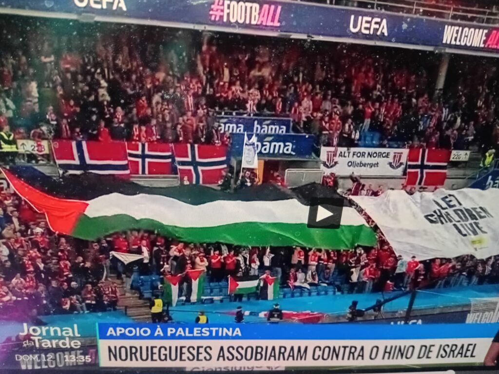 Torcedores noruegueses vaiaram os israelenses e ergueram uma enorme bandeira palestina durante a execução do hino sionista, além de levantarem cartões vermelhos numa clara mensagem de que os jogadores do Estado genocida não eram bem-vindos.