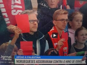 Torcedores noruegueses levantam cartão vermelho para jogadores israelenses, expressando repulsa pela presença do Estado genocida em campo. Foto: Reprodução RTP