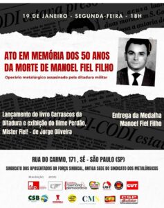 O operário metalúrgico Manoel Fiel Filho assassinado sob tortura há 50 anos no DOI-Codi de São Paulo, o principal centro de tortura da ditadura militar, será homenageado na próxima segunda-feira, 19, às 18h, na antiga sede do sindicato da categoria, hoje sede do Sindicato dos Aposentados da Força Sindical, na rua do Carmo, 171, na Sé, no centro da cidade.